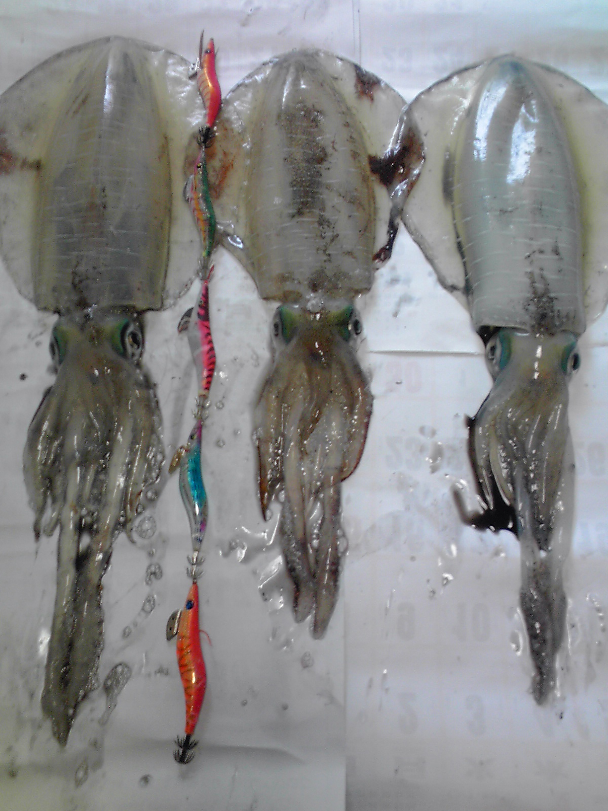 アジの泳がせ釣りでは、2キロ程のイカは釣れたのですが、エギングでのキロオーバーは初めてでそれも三杯!