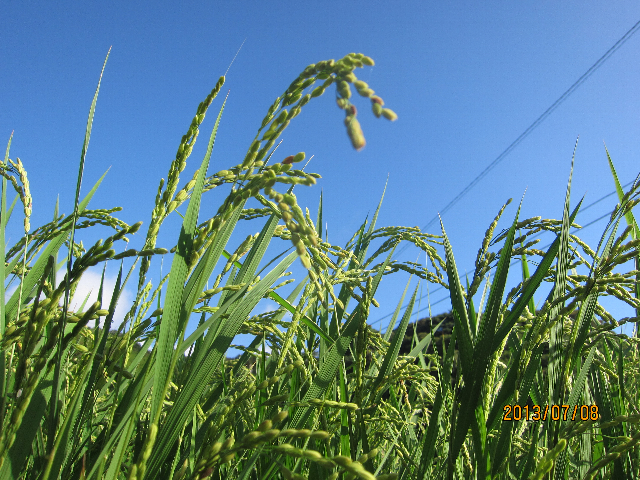 あと1か月もすれば、グリーン一色から黄金色になってきて、そして一斉に稲刈りが始まります。でもこれからの1か月が大変です。台風災害、害虫、病気、イノシシ、スズメなど自然とのたたかいです。おいしい新米を食べるためにも大きな被害がないよう願っています。