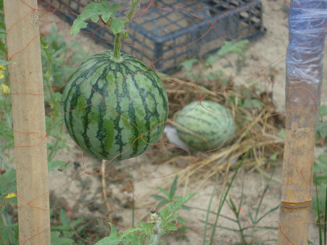 スイカは小玉、ただ今成長中です。甘~いスイカになればいいな。カラスさん食べないでね。