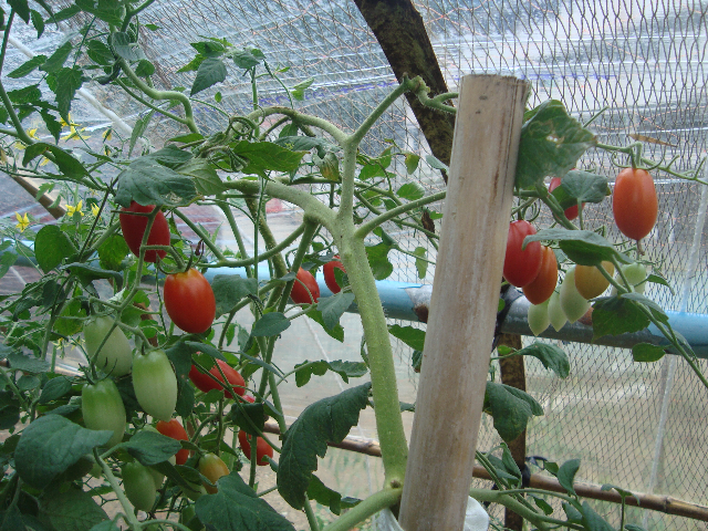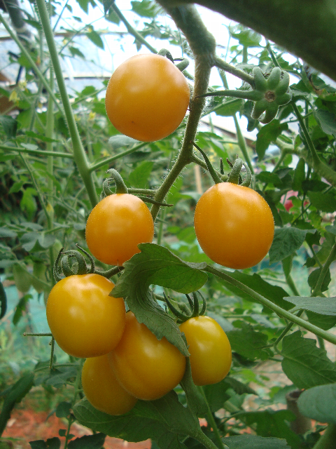 OT畑の手作りのビニールハウスの中で大きくなった可愛いトマトちゃんです。赤と黄色がきれいでしょ。