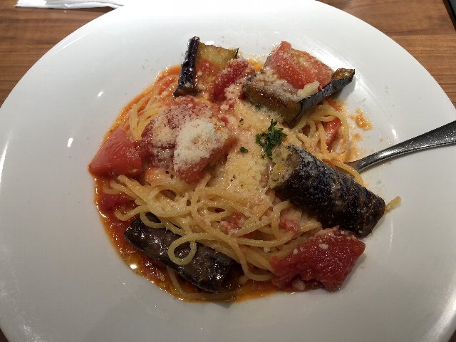 昼食。茄子とトマトのパスタ。